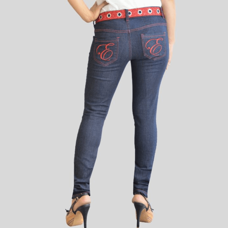 Dopamine Jeans Red Skinny are Dark wash jeans with practically no fading. They are made using Red embroidery and stitching to give it a unique look. – Element Jeans Co.